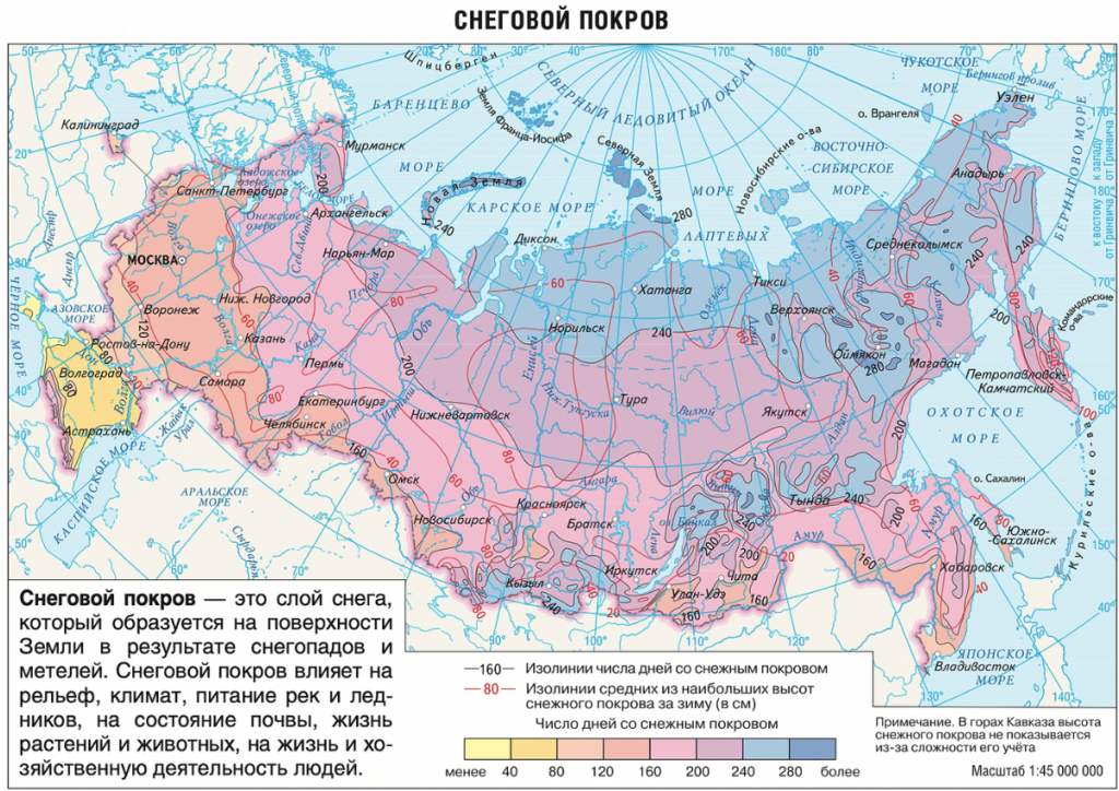 Пояснение: Высота снежного покрова зависит от количества выпадающего снега, от рельефа местности, от плотности снежного покрова, от характера растительного покрова, от силы ветров. В умеренных широтах высота снежного покрова составляет 30-50 см. Наибольшая высота характерна для районов, где зимой выпадает больше атмосферных осадков, а также там, где более продолжительные зимы.
