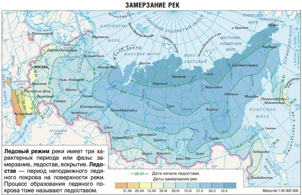 Пояснение: Длительность ледостава зависит от продолжительности и температурного режима зимы, характера водоема, толщины снега. Ледостав — характерная черта почти всех рек России. Продолжительность его уменьшается с севера на юг. Ледостав на реках и озерах севера России начинается в конце октября — начале ноября, на юге — во второй половине ноября, когда среднесуточная температура воздуха опускается до –5°С.