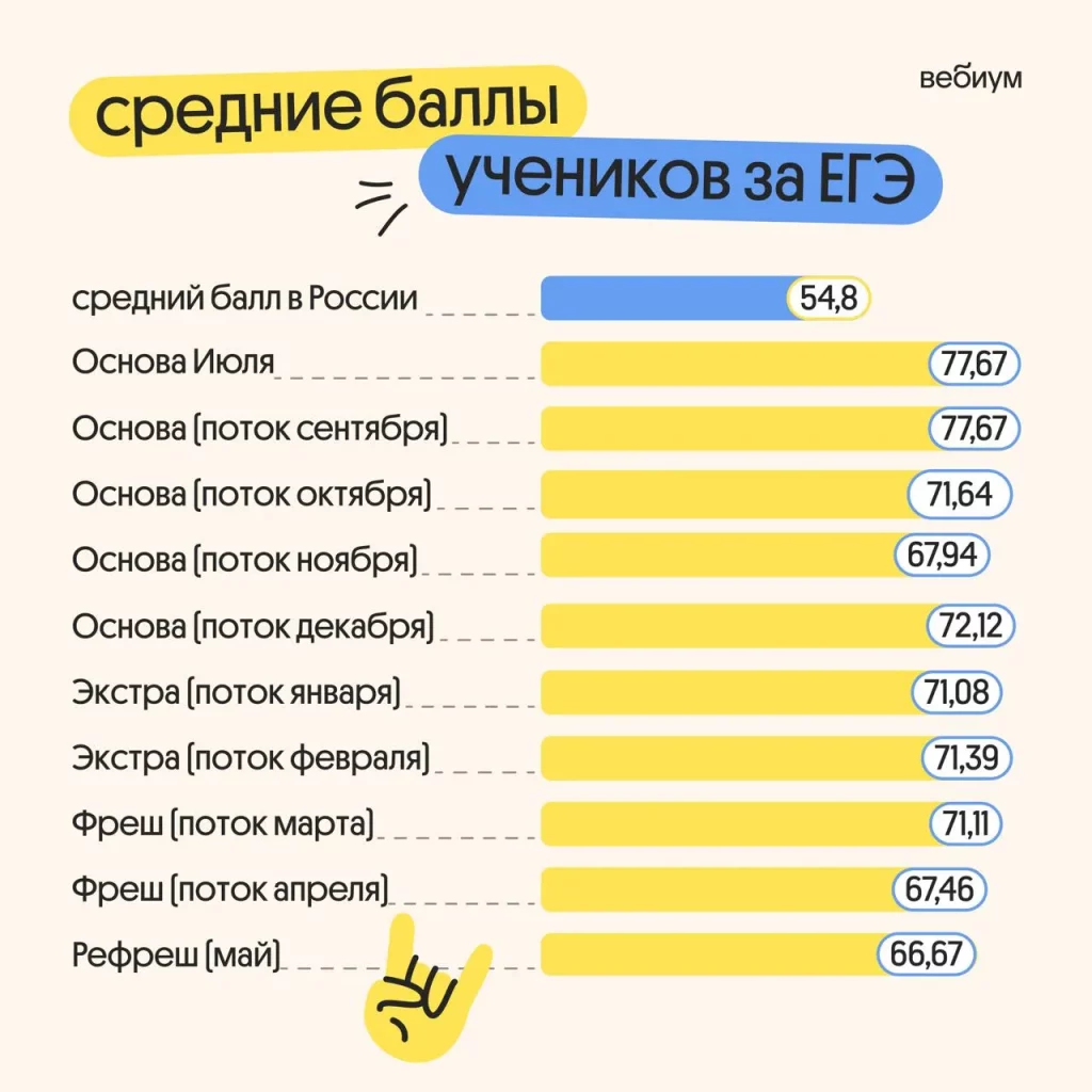 Да, тут никаких «но», звёздочек с мелким текстом и кликбейтов. Мы посмотрели на статистику и поняли, что выше балл за экзамен у тех, кто начал подготовку уже сейчас. Ты можешь стать одним из них и стартануть к желаемым баллам уже сегодня ❤