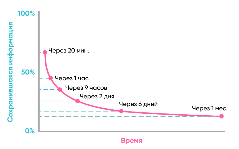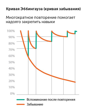 После каждого повторения кривая становилась «плавнее» и «выше», потому что запоминалось больше материала. Через некоторое количество повторений процент запоминания приближается к 90-100%.