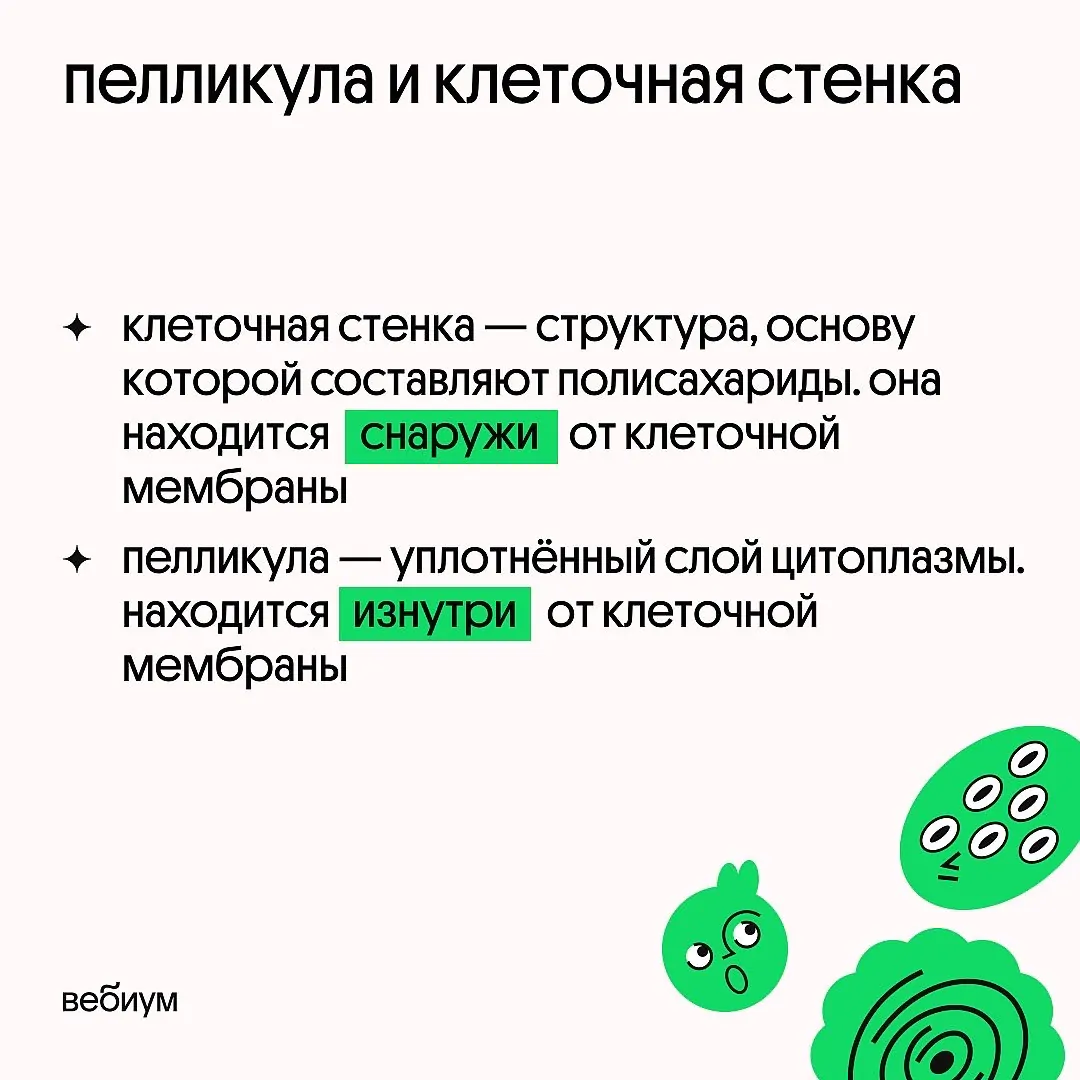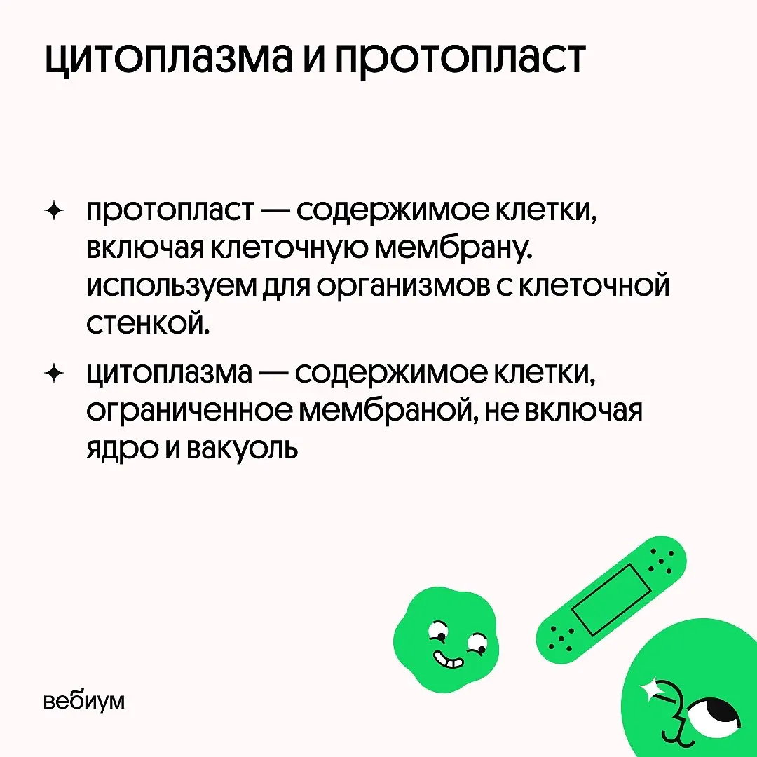Цитоплазма — это содержимое клетки внутри мембраны. Используем для всех живых клеток. ❗️ Будьте внимательны: ядро и вакуоль не считаются частью цитоплазмы!