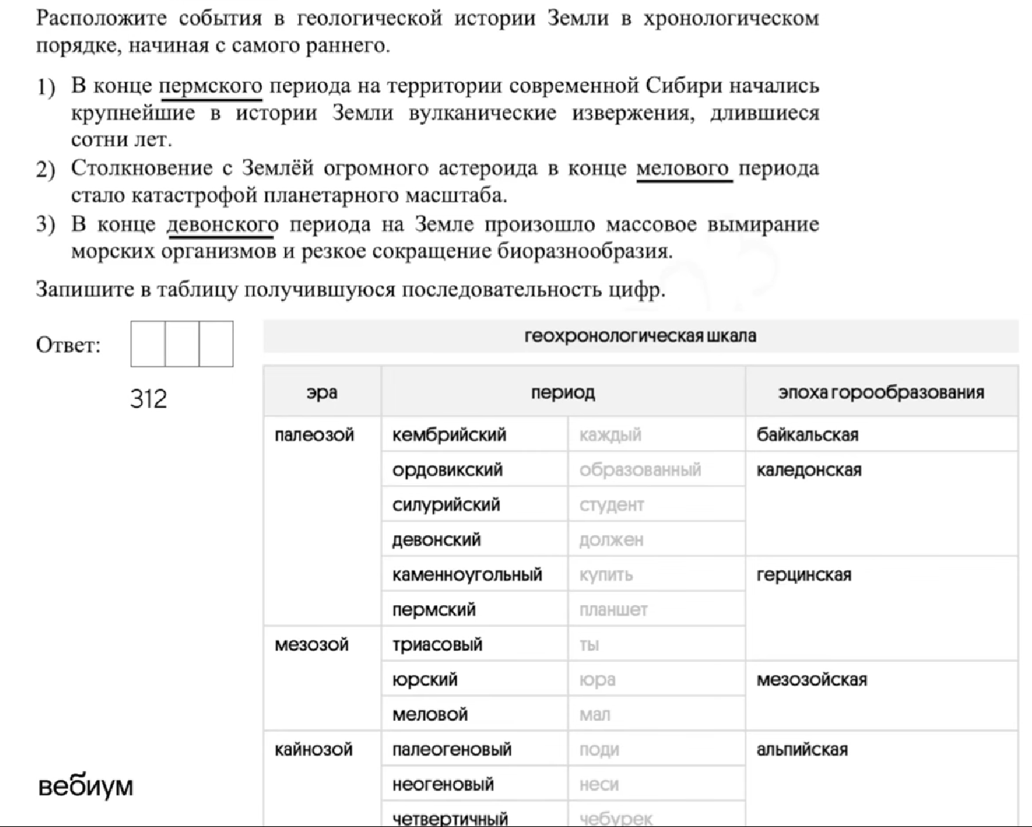 13 задание на периоды геологической истории. Для решения понадобится запомнить геохронологическую таблицу, далее находим названия периодов или эр и располагаем в хронологическом порядке. Запомнить это поможет наша шпаргалка.