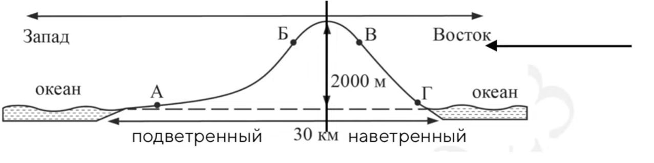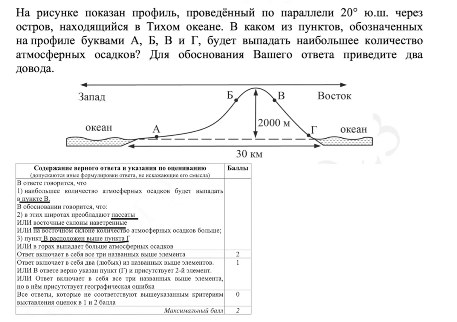 Для этого задания мы должны определить, что 20 градусов ю.ш. — это тропические широты. Здесь преобладают пассаты. Пассаты дуют с востока, следовательно, больше осадков будет выпадать на наветренном склоне. Чем выше, тем больше осадков (например, в горах выпадает больше, потому что температура меньше, водяной пар быстрее достигает точки росы). Склон, на который не дуют ветра, называется подветренный.