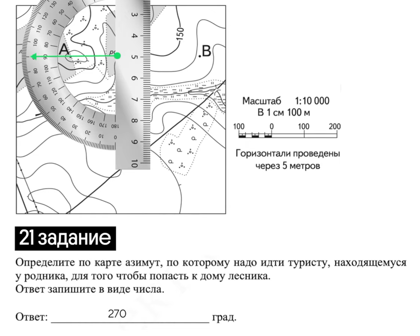 21 задание — задание на определение азимута. Азимут — угол между направлением на север и определяемым объектом. Понадобится транспортир и линейка. Есть погрешность, которая допускается.
