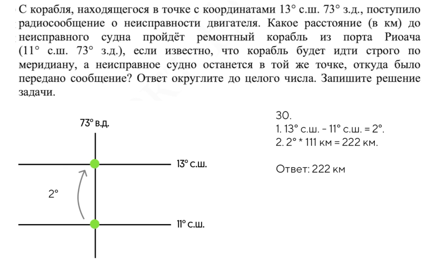 В 30 задании — работа с градусной сеткой. Также будем проходить в сентябре на Основе. Разбор демоверсии ЕГЭ 2023 по географии предоставляет подробное решение двух видов задач: на определение географической долготы и определение пройденного расстояния неисправного судна.
