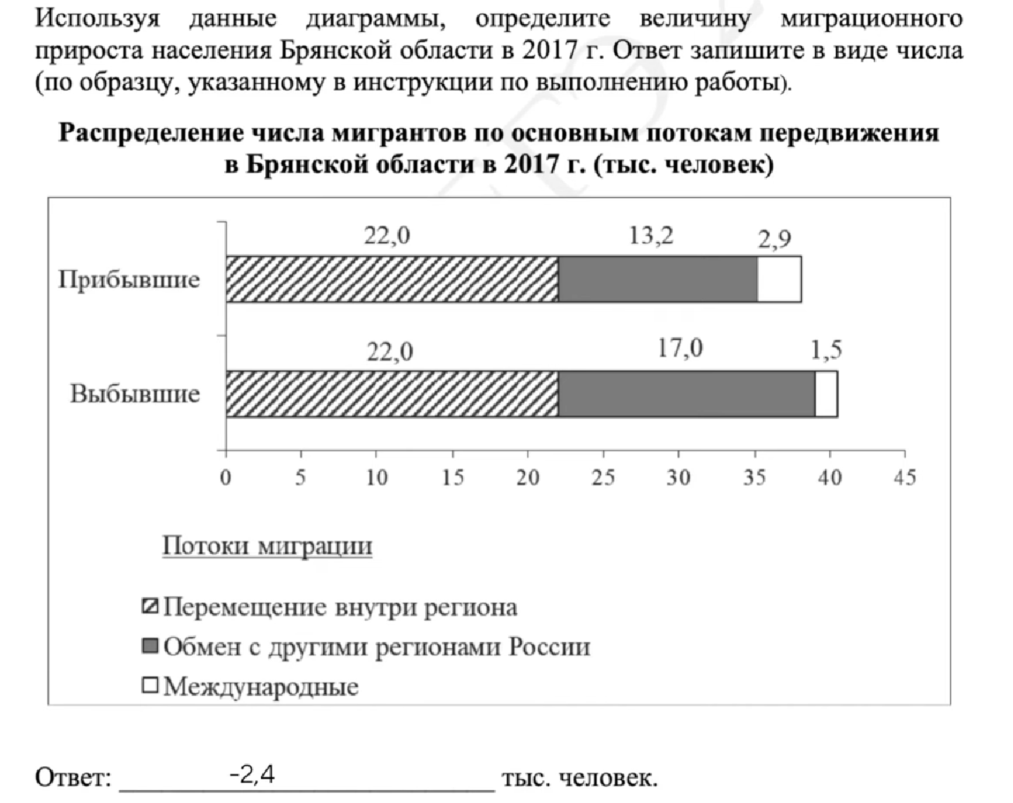 16 задание посвящено миграции России и работе с диаграммой. Ключевая формула: МП (миграционный прирост) = П (прибывшие) — В (выбывшие) = 13.2 — 17.0 = -2.4.