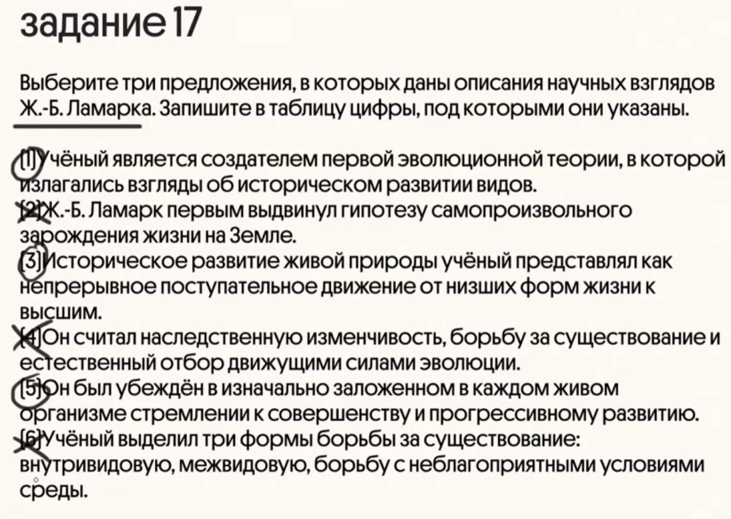 В прошлом году в 17 задании были критерии вида, а сейчас нужно выбрать научные взгляды прапрапрадеда нашего преподавателя Марка Ламарка.