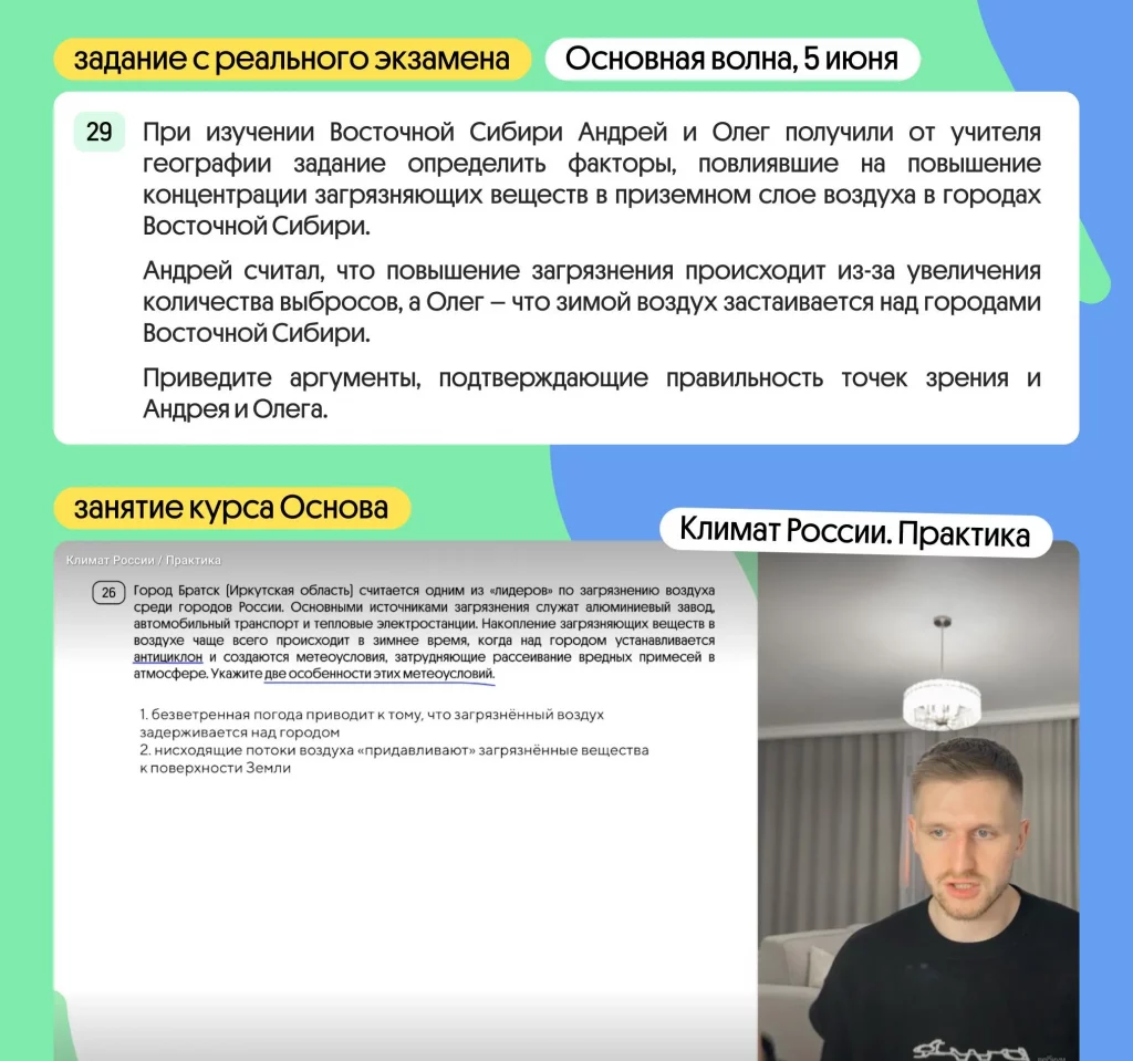 Сделали подборку нескольких примеров 26, 27 и 29 заданий, которые в этом году были на реальном ЕГЭ по географии. А ниже – аналогичные им типы заданий, которые мы с учениками разобрали на занятиях.