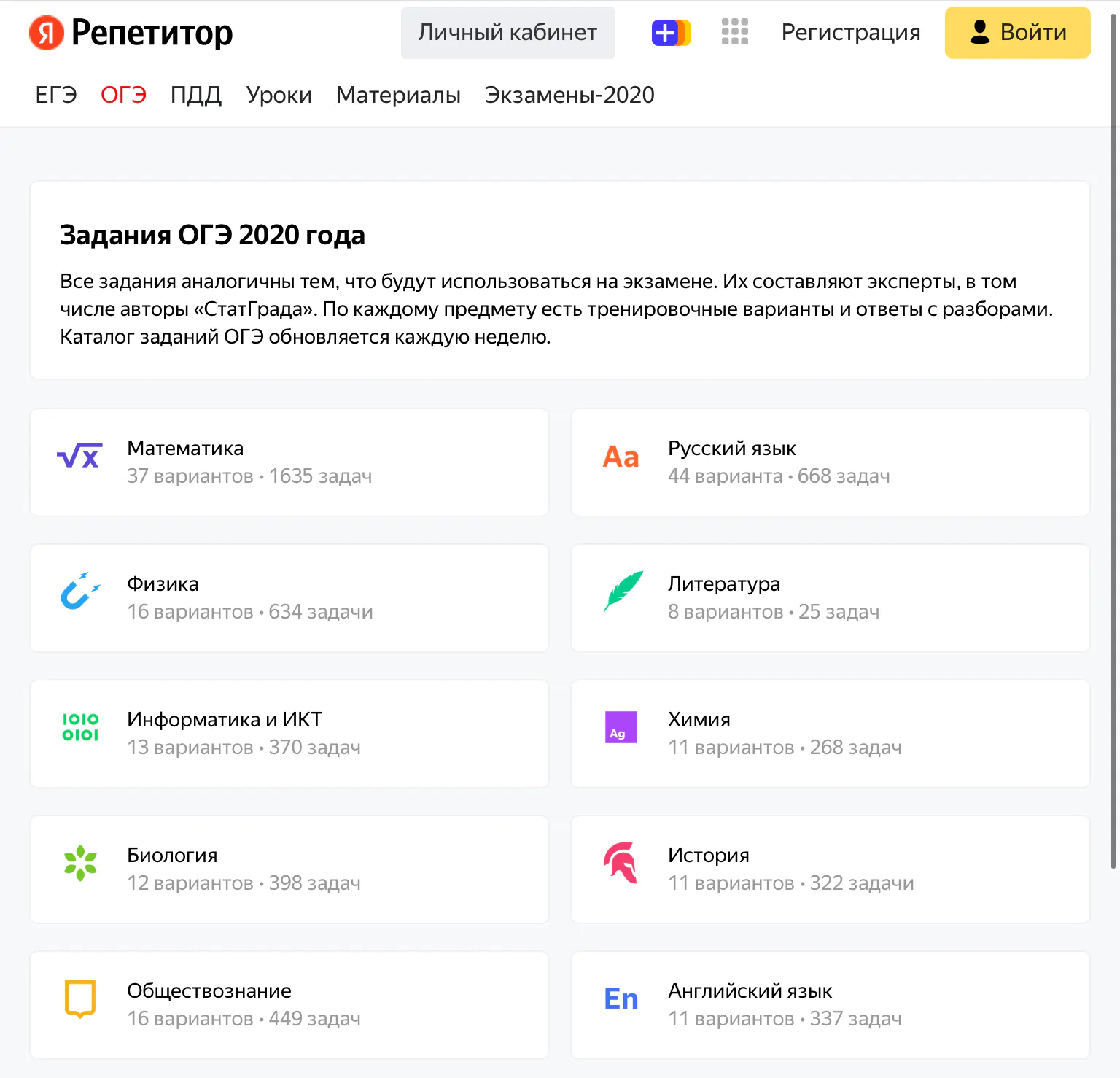 На этом сайте собраны варианты ОГЭ по всем предметам. Решать можно полноценные КИМы. Для этого таймер отсчитывает время, как на реальном экзамене, вы выписываете верные ответы и завершаете работу. После этого сайт показывает первичные баллы и ответы. Нажав на значки справа от задания, можно посмотреть пояснение и способ решения.