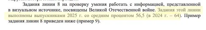 Информация от разработчиков ЕГЭ 2026 по истории: «Задания линии 8 на проверку умения работать с информацией, представленной в визуальном источнике, посвящены Великой Отечественной войне. Задания этой линии выполнены выпускниками 2025 г. со средним процентом 56,5 (в 2024 г. — 64)».