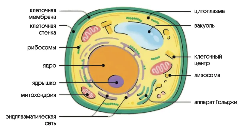 Главные признаки на рисунке: хлоропласты или другие пластиды, большая вакуоль, клеточная стенка.