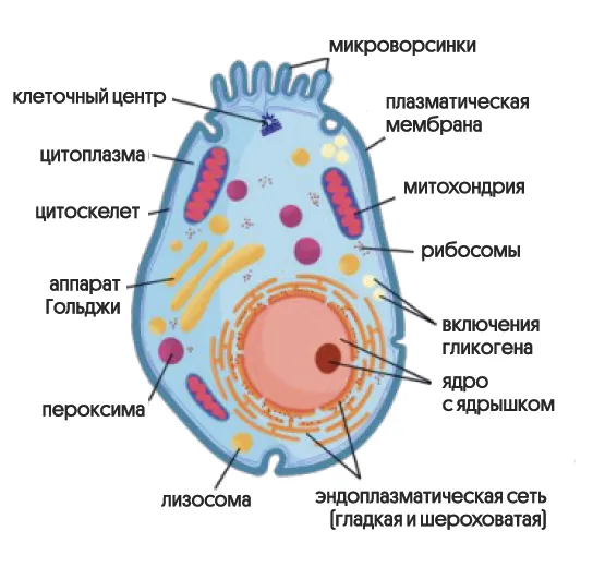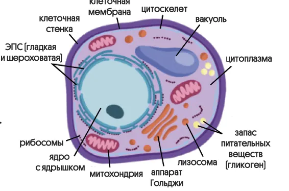 Мембранные органоиды (митохондрии — овальные органоиды с внутренними поперечными перегородками — кристами; ЭПС — сеть каналов; комплекс Гольджи — стопки плоских цистерн). Всё это изображено в цитоплазме обеих клеток.