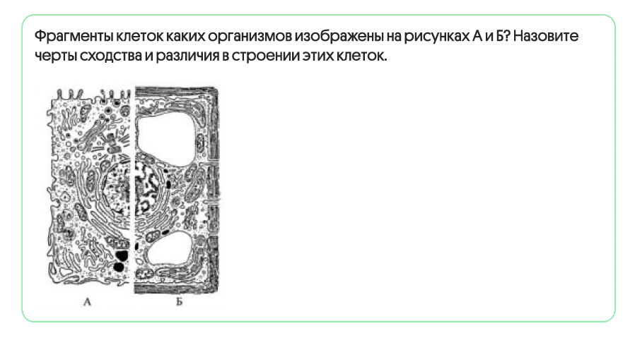 На рисунке Б видно толстую клеточную стенку, крупную вакуоль и овальные двумембранные органоиды с параллельными складками — тилакоидами. Это пластиды. Делаем вывод, что на рисунке признаки растительной клетки.