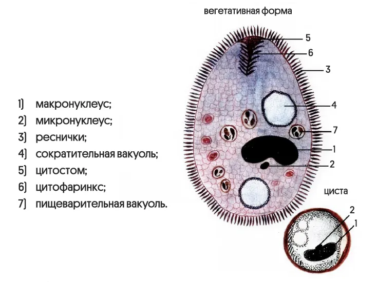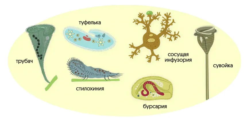 Среди них есть свободноживущие (например, инфузория-туфелька, инфузория-трубач) и паразитические (например, балантидий) формы.