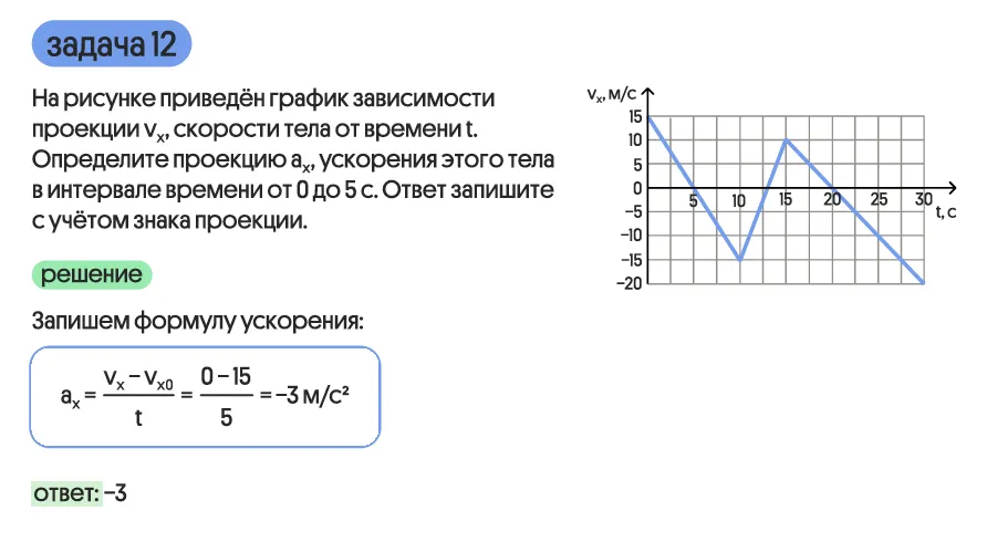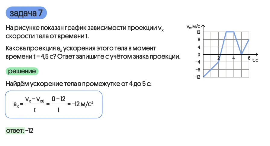 Определите проекцию axa_x ускорения этого тела в интервале времени от 0 до 5 с. Ответ запишите с учётом знака проекции.