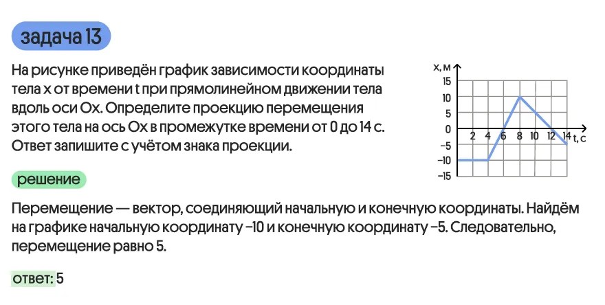 Определите проекцию перемещения этого тела на ось Ox в промежутке времени от 0 до 14 с. Ответ запишите с учётом знака проекции.