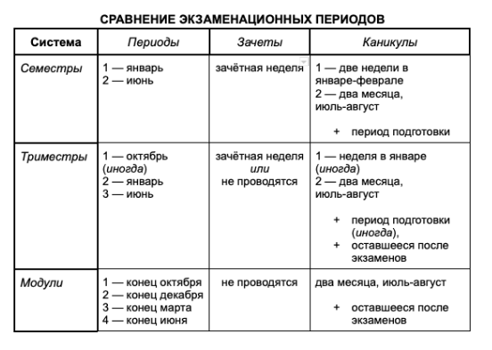 Почти аналогично экзамены проходят в вузах, обучающихся по модулям, то есть четвертям. Это практически школьная система. Она предусматривает все четыре экзаменационных периода — два облегчённых осенью, весной; два полноценных зимой, летом. Например, НИУ ВШЭ выделяет на них неделю, независимо от количества предметов, а зачётов нет вообще. При этом, первая сессия в конце октября может быть пустой! А вот зимняя, проходящая за неделю до Нового года, — состоять из всех семи дисциплин.